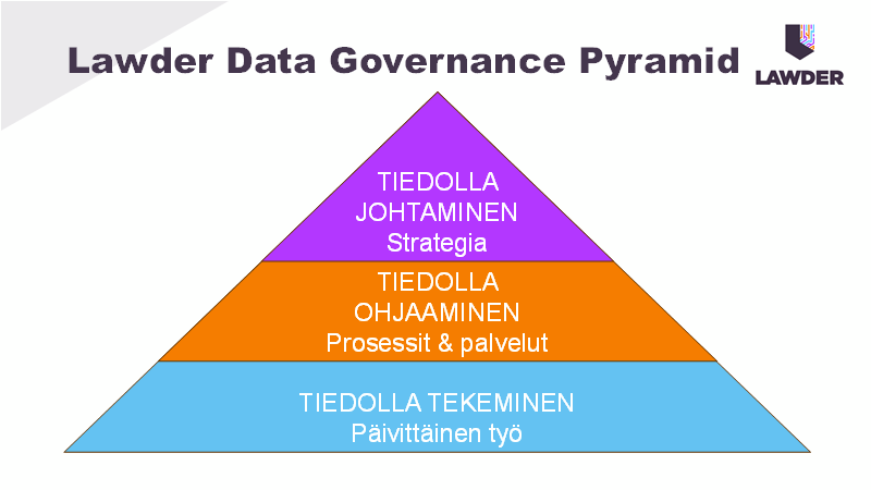 Vaikka keskustelu keskittyy usein tiedolla johtamiseen, suurin osa datan todellisesta arvosta syntyy tiedolla ohjaamisen ja tiedolla tekemisen tasolla – juuri siellä, missä organisaatiossa tehdään päivittäin satoja tai tuhansia päätöksiä. Tämä muodostaa Lawderin data governancen pyramidin.